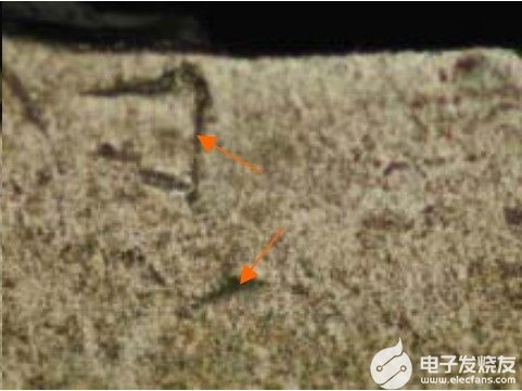 圖28 ?脫落焊球的局部放大照片? ? ? ? ? ? ? ?圖29 ?脫落焊球內部出現(xiàn)裂縫的典型照片