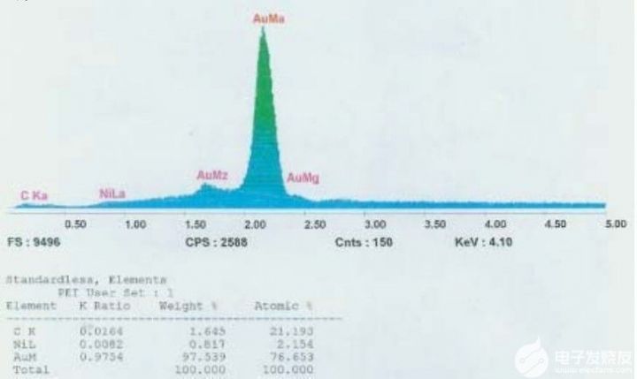 接著對空白PCB的焊盤進行SEM觀察,發(fā)現(xiàn)焊盤表面存在裂縫,這說明金鍍層的表面的致密性不夠良好(見圖34和圖35),對焊盤進行EDAX 分析(結果見圖36),發(fā)現(xiàn)主要存在碳(C),鎳(Ni)和金(Au)等元素,由焊盤表面含有碳,這說明焊盤表面粘附的外來污染物為有機物。