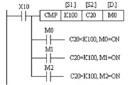 這是一條三個操作數(shù)的指令。它對源操作數(shù)的數(shù)據(jù)作代數(shù)比較(如-2<1)。且所有源操作數(shù)的數(shù)據(jù)和目標操作數(shù)的數(shù)據(jù)均作二進制數(shù)據(jù)處理。程序中的M0M1M2根據(jù)比較的結(jié)果動作。K100>C20的當前值時M0接通;K100=C20的當前值時M1接通;K100<C20的當前值時M2接通。當執(zhí)行條件X0=OFF時,CMP指令不執(zhí)行。M0M1M2的當前值保持不變。