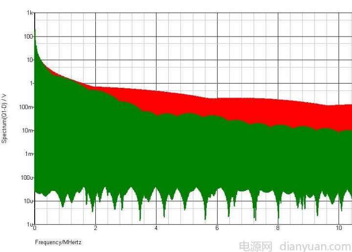 紅色的是R3=1歐姆,綠色的是R3=100歐姆??梢?,驅(qū)動(dòng)電阻大的時(shí)候,高頻諧波明顯變小。