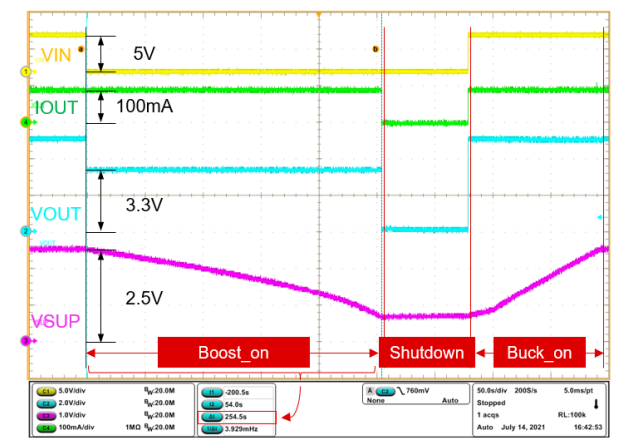 當(dāng)系統(tǒng)功率突然下降時,TPS61094 立即進(jìn)入 Boost_on 模式,并利用超級電容器的功率調(diào)節(jié) VOUT。降壓/升壓轉(zhuǎn)換器在 254.5s 內(nèi)提供所需的輸出電流,可處理 11.5 次 NB-IoT 事務(wù)。TPS61094 對超級電容器放電,直到其電壓降至 0.7V;此時,該器件進(jìn)入關(guān)斷模式,直到系統(tǒng) VIN 恢復(fù)。在 Buck_on 模式下,TPS61094 以恒定電流為超級電容器無縫充電。如圖 2 所示,超級電容器放電和充電之間的切換非常平穩(wěn)。
