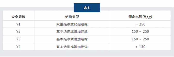 首先,安規(guī)電容的額定電壓必須適應(yīng)應(yīng)用場(chǎng)合的電壓要求。比如 Y 類安規(guī)電容不同的安全等級(jí)和絕緣類型,就對(duì)應(yīng)著不同的額定電壓,如表1所示。