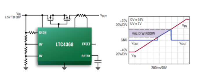 以LTC4368為例,它可以實(shí)現(xiàn)過(guò)壓(OV)、欠壓(UV)、過(guò)流(OC)、反向輸入(RI)四種保護(hù),基本覆蓋了應(yīng)用現(xiàn)場(chǎng)會(huì)出現(xiàn)的各種工況,為后級(jí)電路提供了完善的保護(hù)解決方案。
