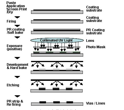 2.光刻或光致成圖技術(shù)。先燒結(jié)成膜,再光刻成圖工藝的材料通常有有機(jī)銀漿、薄印銀及無玻璃導(dǎo)體等;先光刻后成膜所采用的漿料因其具有光敏性,可以在經(jīng)過曝光、顯影后直接成圖,省去了光刻膠步驟,且能夠提高導(dǎo)體線條的精度。Thick Film Lithography就是此工藝,也是目前實(shí)際在規(guī)?;慨a(chǎn)的高精度厚膜燒結(jié)工藝技術(shù)。