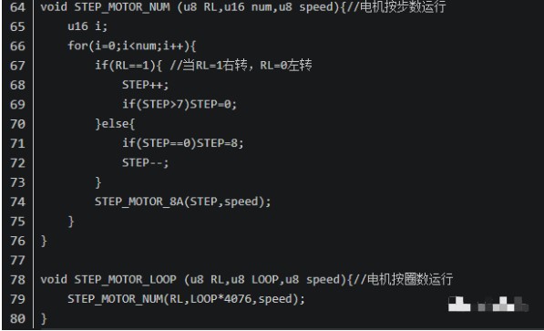 按圈數(shù)運(yùn)行,這里值得說(shuō)明的是,步進(jìn)電機(jī)每旋轉(zhuǎn)一個(gè)完整的周期(8拍)并使是轉(zhuǎn)軸旋轉(zhuǎn)了一圈,電機(jī)內(nèi)部是由減速齒輪的,所以一個(gè)周期并不是一圈,這之間有一個(gè)轉(zhuǎn)換關(guān)系,不同的電機(jī)比例系數(shù)不同,這里也可以通過(guò)調(diào)節(jié)系數(shù),來(lái)對(duì)電機(jī)進(jìn)行旋轉(zhuǎn)角度的控制。