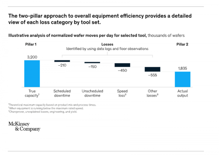 然后,晶圓廠應(yīng)檢查 OEE 基準(zhǔn),該基準(zhǔn)顯示每個(gè)工具的最大產(chǎn)能,使用雙支柱方法將理論最大產(chǎn)能與實(shí)際產(chǎn)量進(jìn)行比較(圖表 1)。為了確定導(dǎo)致產(chǎn)能欠佳的具體因素,晶圓廠經(jīng)理可以檢查數(shù)據(jù)日志、采訪關(guān)鍵員工并進(jìn)行現(xiàn)場觀察。這項(xiàng)研究將幫助他們量化停機(jī)時(shí)間、確定設(shè)備速度并發(fā)現(xiàn)其他問題,例如低效的轉(zhuǎn)換時(shí)間。在一個(gè)案例中,工具級分析顯示,晶圓廠的晶圓產(chǎn)量比其真實(shí)產(chǎn)能低 43%。