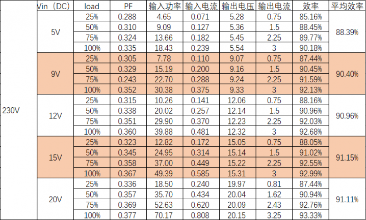 充電器本質(zhì)上是一種轉(zhuǎn)換設(shè)備,過(guò)程中會(huì)有損耗,以熱量的形式散發(fā)出來(lái)。我們平時(shí)看充電器上面的參數(shù)輸出100W或者65W是充電器可以為設(shè)備提供的最大輸出功率,但充電器從插座上汲取的功率往往要更大一些,下面是充電模塊的各檔位電壓,在110V~230V(大致范圍)交流輸入情況下分別進(jìn)行了轉(zhuǎn)換效率測(cè)試,測(cè)試結(jié)果如下。